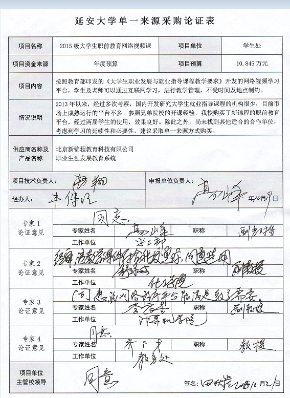 米兰milan官方网站职前教育网络视频课采购项目拟采购职业生涯发展教育系统。拟采取单一来源采购方式采购,由北京新锦程教育科技有限公司提供。现将有关情况向潜在供应商广泛征求意见。征求意见期限从2016年10月21日起至2016年10月23日止。潜在供应商对公示内容有异议的,请于公示期满后2个工作日内以实名书面(包括联系人、地址、联系电话)形式将意见反馈至米兰milan官方网站国资处(联系电话:0911-2332042)和米兰milan官方网站监察处(联系电话:0911-2332090)。