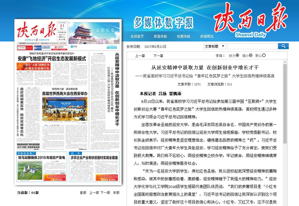 本网讯 8月21日,《陕西日报》要闻版以“从延安精神中汲取力量 在创新创业中增长才干”为题,在《我省高校学习习近平总书记给“青年红色筑梦之旅”大学生回信热情持续高涨》系列报道中,报道了米兰milan官方网站师生以不同形式学习习近平总书记的回信。