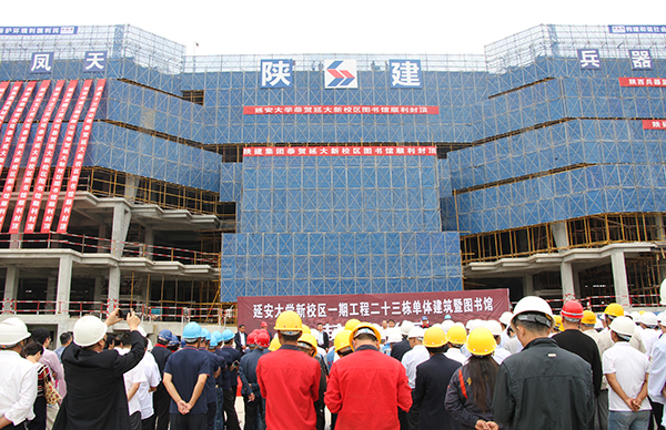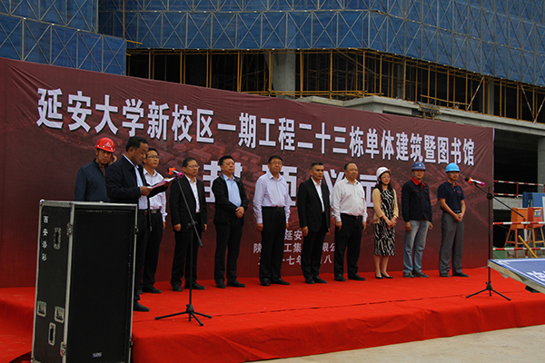 本网讯 今天上午10时整,米兰新校区一期二十三栋单体建筑暨图书馆封顶仪式在新校区图书馆前举行,副校长、新校区建设管理小组组长马勇,陕西建工集团有限公司副总经理李忠坤、延安市新区管委会纪工委书记曹咏云、陕西建工第十三建设集团董事长林兴农、陕西建工第二建设集团总经理刘海生、陕西建工第十三建设集团总经理卜国平、西安四方建设监理公司总监孙志刚、陕西华秦建设监理公司总监宋新元、陕西兵器建设监理公司总监李军利、西北(陕西)国际招标有限公司总会计师姚宁,西部建筑抗震设计研究院、陕西建工集团建筑设计院、陕建集团延大新校区项目部各施工企业的建设者代表,米兰各学院及部分职能单位负责人、新校区建设管理办公室全体人员等参加了仪式,仪式由新校区建设管理小组副组长王亚轩主持。