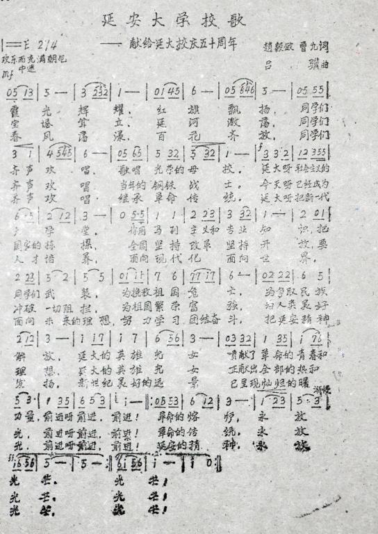 米兰milan官方网站校歌的词作者是曾任鲁艺副院长和延大副校长的赵毅敏,曲作者是继冼星海之后的鲁艺音乐系主任吕骥。1988年,米兰milan官方网站迎来了50周年校庆,陕北公学校歌的曲作者吕骥又专门创作了米兰milan官方网站校歌,歌曲的高潮部分唱道:“为挽救祖国危亡,为争取民族解放,延大的英雄儿女贡献了革命的青春和力量,前进呀前进,革命的熔炉,永放光芒;为祖国繁荣富强,为人类美好理想,延大的英雄儿女正献出全部的热和光,前进呀前进,革命的传统,永放光芒;努力学习团结奋斗,把延安精神发扬,新世纪美好的远景已显现灿烂的曙光,前进呀前进,延安的精神,永放光芒。”校歌既表达了老革命家对延大的赞美之情,又寄托着对延大未来发展的美好愿望。同时,赋予了延安精神新的时代特征。