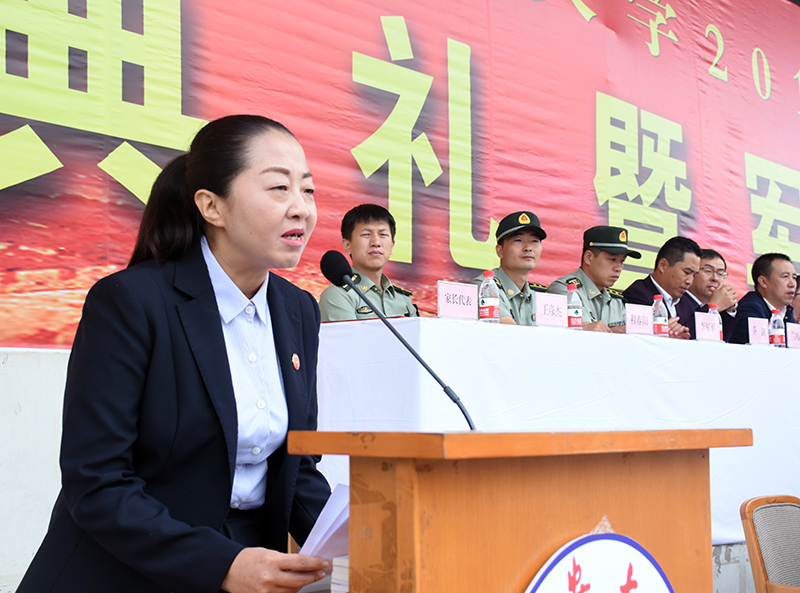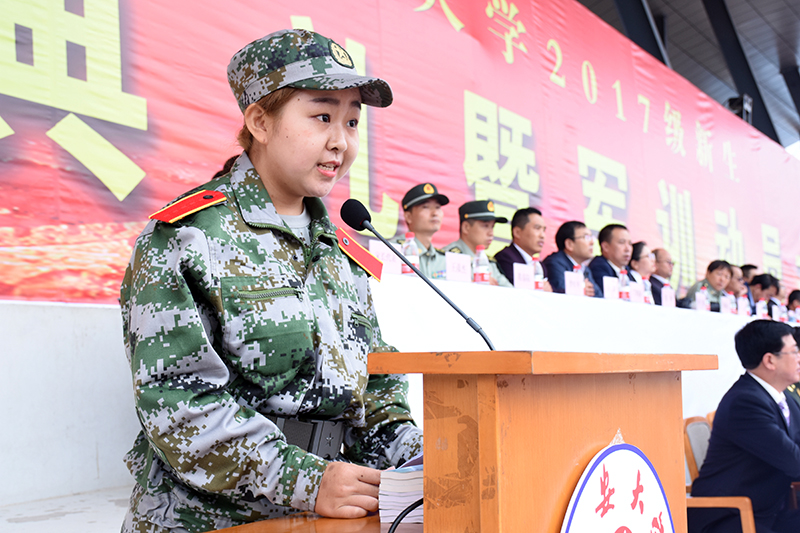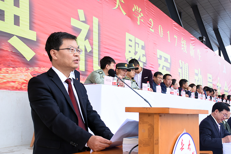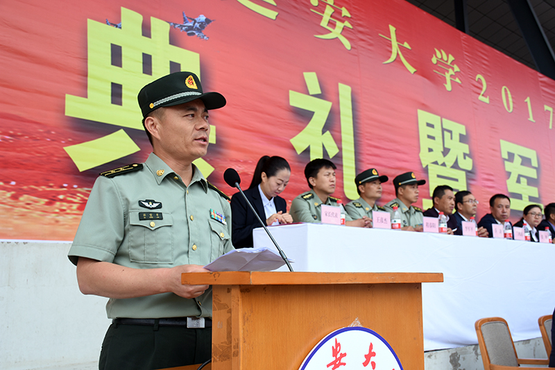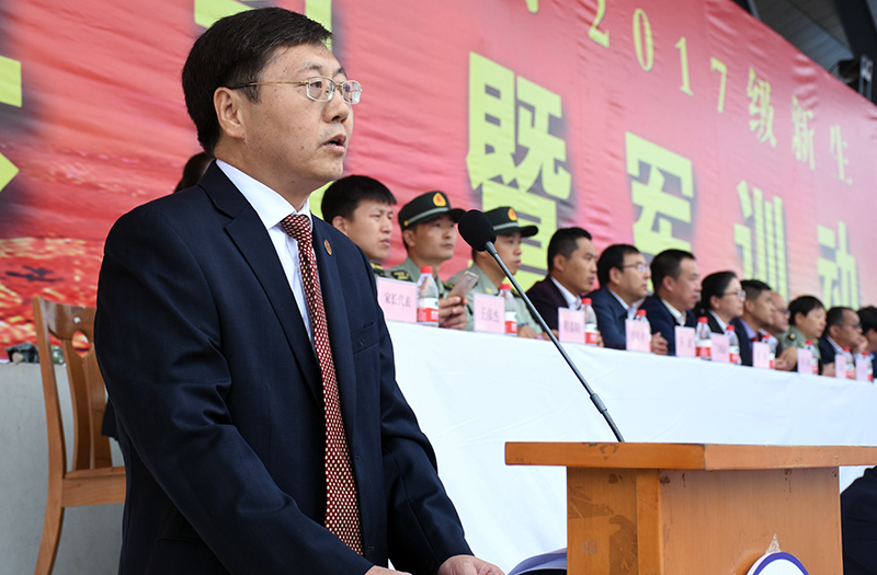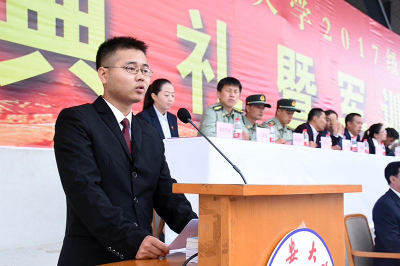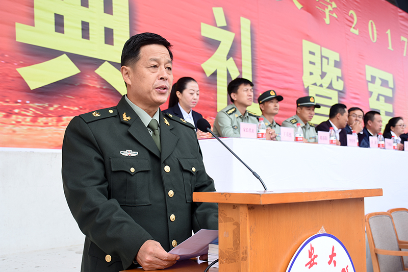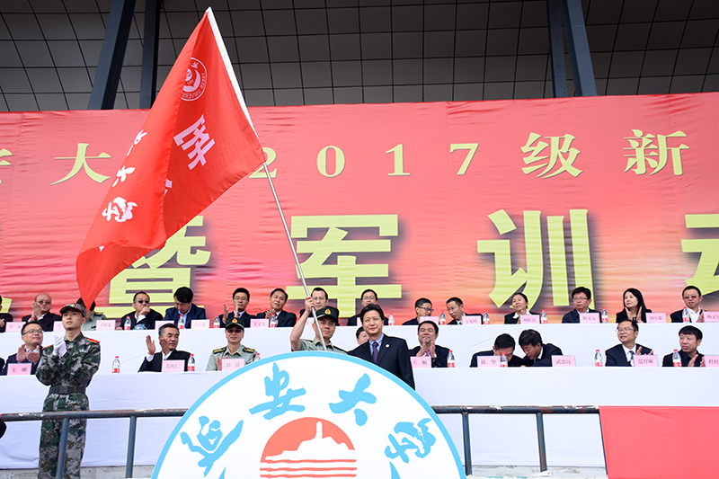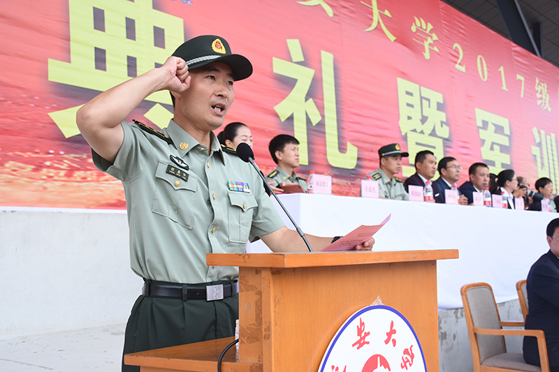 随后,党委书记薛义忠向军训团授旗,军训团团长杜空军中校代表军训团接旗。校武装部副部长王彦杰宣读了军训团纪律,军训团副团长程春阳带领全体参训学员宣了誓。军训团团长杜空军中校在讲话中对同学们提出了三点要求,一是要有保家卫国的责任担当;二是要培养吃苦耐劳精神,磨砺意志品质;三是要自觉遵规守纪,增强号令意识。他要求各承训教官科学施训、文明施训、严格施训,把严格与关心结合起来,把训练与引导结合起来,把军训与校训结合起来。