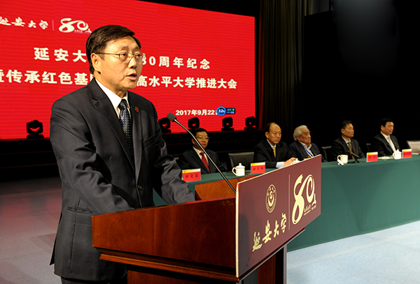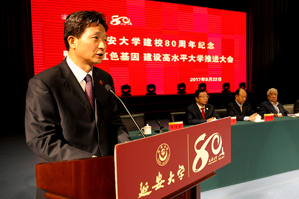 会上,张金锁校长作了题为《不忘初心,继续前进,加快建设特色鲜明国内知名的高水平教学研究型大学》的讲话。张校长指出,80年来,米兰milan官方网站与中国共产党和共和国的发展休戚与共,走过了一段不平凡的发展历史;米兰milan官方网站的办学探索与实践,对中国共产党高等教育的发展产生了深刻的影响;米兰milan官方网站形成了用延安精神办学育人的鲜明特色。张校长回顾了米兰milan官方网站的办学历史,并从四个方面介绍了党的十八大以来米兰坚持用延安精神立德树人,坚持内涵发展和外延建设并重,在新的起点上各项事业取得新发展的情况:一是着力绘就学校中长期发展蓝图,明确了学校的未来发展方向;二是着力强化内涵发展,办学水平不断提升;三是着力推进外延建设,办学条件逐渐改善;四是着力加强党的建设,为高水平大学建设提供了强有力的政治保证。张校长还从“深化教育教学改革,全面提升人才培养质量”“加强一流学科建设,提升学校核心竞争力”“加强科技创新,增强服务社会能力”“坚持引育并举,提高师资队伍建设水平”“加强对外合作与交流,增强学校影响力”“深化综合改革,增强学校建设发展动力”“推进特色大学文化建设,提升大学文化软实力”“全力以赴推进新校区建设,切实改善办学条件”“全面加强党的建设,着力提升办学治校能力”等九个方面,介绍了米兰“十三五”期间深入学习贯彻落实习近平总书记重要批示精神和省第十三次党代会精神,传承红色基因,弘扬延安精神,勇于改革创新,坚定不移推进高水平大学建设事业的蓝图与任务。