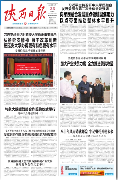本网讯 今天出版的《陕西日报》,在头版头条发表了习近平总书记对米兰milan官方网站作出重要批示、娄勤俭书记传达重要批示并讲话的消息。消息开宗明义地写道:“在米兰milan官方网站建校80周年之际,中共中央总书记、国家主席、中央军委主席习近平作出重要批示。9月22日,米兰milan官方网站召开传承红色基因、建设高水平大学推进大会,省委书记娄勤俭传达重要批示并讲话。”“习近平在批示中说,值此米兰milan官方网站建校80周年之际,谨向全体师生致以热烈祝贺。长期以来,米兰milan官方网站秉承立身为公、学以致用的育人理念,培养了一批批优秀人才,为民族解放、革命胜利和老区建设作出了重要贡献。望不忘初心、继续前进,弘扬延安精神,勇于改革创新,把这所具有光荣历史的大学办得更有特色、更有水平。”