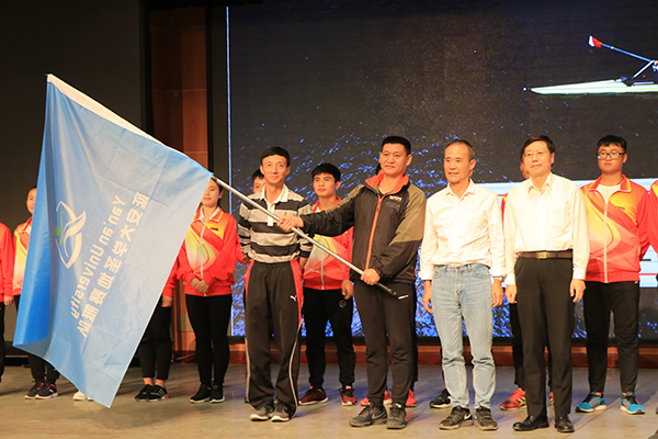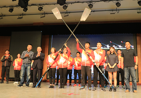 随后举行了米兰milan官方网站“圣地赛艇队”成立仪式。张金锁校长与王石先生共同向体育学院院长郑兵及赛艇队教练钱军师授旗,4位优秀企业家向赛艇队队员授桨。最后举办了赛艇陆上划船器交流比赛。比赛分为4各参赛队,每队共六人参赛,由企业家、校方人员及学生队员组成,激烈的比赛让同学们更直接地感受赛艇运动的魅力。王石先生在比赛后的点评中表示将提供更多的保障,携手延大,深化合作,祝愿延大学子与米兰milan官方网站有更加灿烂辉煌的未来。