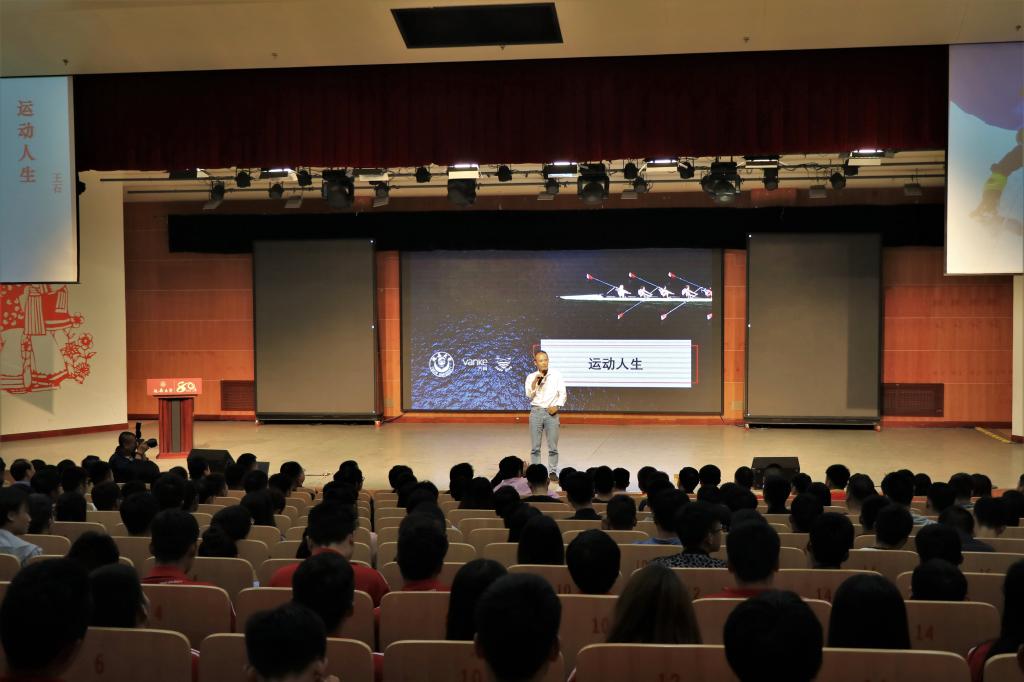 王石先生以“运动人生”为主题发表演讲。王石先生分享了自己的运动经历与心得体会,强调了目标的实现与更新、方向的选择与准备、克服困难的坚持与毅力。并与在场学生就为什么选择创业、普通高校学生的竞争力等问题进行了交流。
