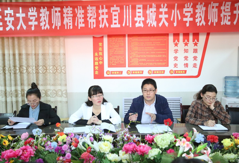 4位教师根据自身专业特点分别对口帮扶4所学校。张建平博士从加强自身学习,提高业务能力,调节课堂气氛,提高课堂驾驭能力等方面对宜川县初级中学数学教师提出了建议,并对如何规范数学语言,实施分层教学,提高课堂教学效果给出了方法和策略;吕佳副教授结合宜川县城关小学听课看课情况,从数学教学思维出发,了解和分析了该校“尝试性教学”的特色教育模式的利弊,并就实施过程中存在的问题及个人建议与任课教师们进行了深入交流,帮助提升课堂教学效果;张永芳副教授结合宜川县第一小学实际状况制定了适合该校教师教育信息化意识和能力提升的帮扶计划,并无偿提供了大量教学资源,提升了该校教师的认识,开阔了眼界,厘清了思路和方法;谢芬莲讲师在宜川第四幼儿园开展了《幼儿园集体教学活动的思考》和《幼儿园活动区的设计与材料提供》专题讲座,指导教师备课、试课,并对学前教育活动设计的相关问题进行了交流讨论。