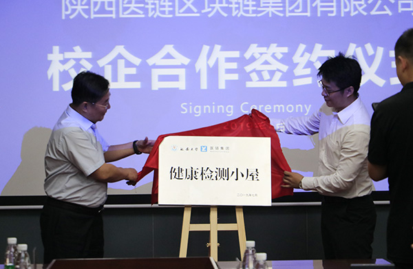 陈华副校长和牛子杰副总裁代表双方签字并为健康检测小屋揭了牌。