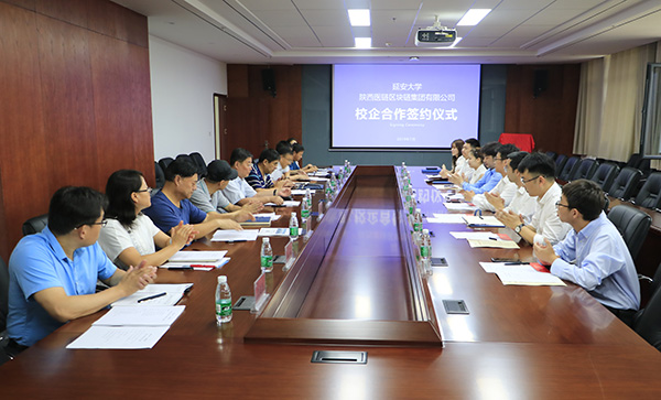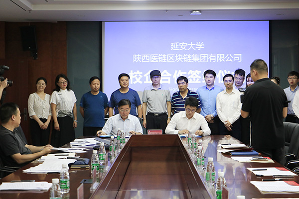 本网讯 7月22日上午,米兰milan官方网站与陕西医链区块链集团有限公司校企合作签约仪式在新校区行政楼七楼会议室举行。米兰副校长陈华及后勤管理处、国资处、党政办、党委宣传部、学工部、工会、财务处、校医院相关负责人,医链集团执行董事、副总裁牛子杰及集团教育事业部、城市运营部、诊所事业部、药店事业部、政企关系部相关负责人参加了签约仪式。签约仪式由米兰后勤管理处处长、后勤集团总经理赵贞主持。