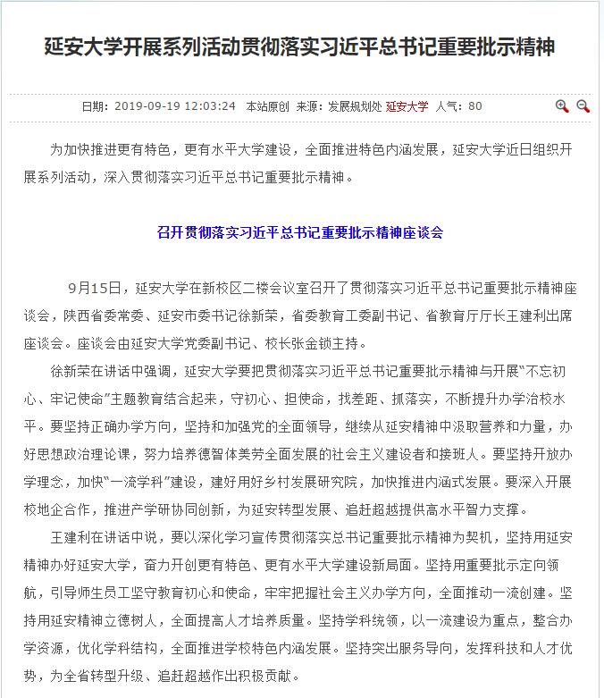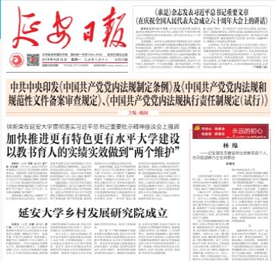 此前,9月16日,《延安日报》分别在头版头条、第二条及第二版醒目位置以《徐新荣在米兰milan官方网站贯彻落实习近平总书记重要批示精神座谈会上强调——加快推进更有特色更有水平大学建设以教书育人的实绩实效做到“两个维护”》《米兰milan官方网站乡村发展研究院成立》《首届乡村发展论坛在米兰milan官方网站举行》《米兰milan官方网站原创舞台剧<路遥的世界>公开演出》为题,发表了由该报记者和米兰校报记者袁广斌等联合采访的相关报道。当日的《延安日报》,还在第六版发表了通讯《奉献的人生才最美——记延大附院心脑血管病医院急诊科护士徐丽娜》。