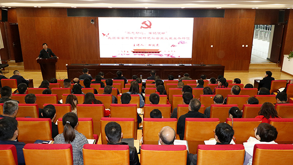 党课的主题为:不忘初心、牢记使命——必须牢牢把握中国特色社会主义最基本特征。党课内容主要分为三个部分,第一部分概述了党的初心与使命。田伏虎副书记分别从新民主主义革命时期、社会主义革命和建设时期、改革开放新时期和中国特色社会主义新时代等四个历史时期梳理了中国共产党的初心和使命。第二部分讲述了党的领导是中国特色社会主义的最本质特征。通过理论逻辑、历史逻辑、政治逻辑、现实逻辑等四个层面分析指出了中国共产党的领导是中国特色社会主义的内在逻辑要求;通过理论上、政治上、思想上、根本宗旨上、组织和制度上、纪律和作风上等六个方面,阐释了中国共产党的领导具有独特的优势。第三部分讲述了“不忘初心、牢记使命”必须坚持和加强党的领导,并从坚持党对一切工作的领导、加强党的建设和加强高校党委的领导三个方面进行了详尽解读。