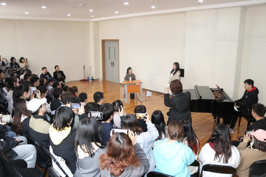 仪式结束后,举办了“学党史名家进校园,王二妮陕北民歌现场教学活动。王二妮在合唱教室对5名本科生、研究生代表进行了现场教学示范和指导。她指出,陕北民歌以其独特的地域风格和表现形式备受人们喜爱,作为鲁艺学生一定要夯实基本功,在不断学习中体悟陕北民歌的精髓。