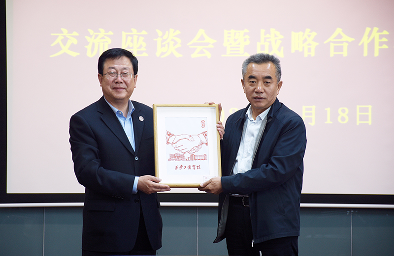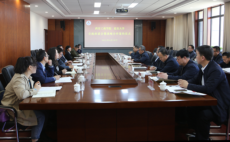 叶曲炜介绍了西安工商学院的发展战略、院系设置、学科专业等情况,并就促进学院未来发展提出了思路和想法,希望两校以这次交流座谈会暨战略合作签约为契机,建立更紧密的联系。田伏虎从学院党的建设、地域优势、与延大合作的领域等方面提出了补充意见和建议。
