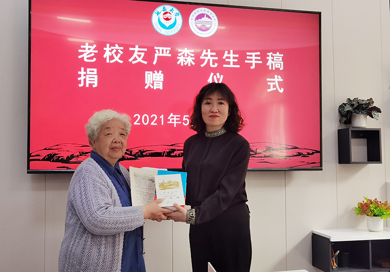捐赠仪式上,严森的女儿严苏建深情讲述了父亲的生平往事,严苏华代表家属向学校捐赠了严森先生的手稿、照片、书籍等珍贵档案史料,校史馆馆长李霞接受了捐赠。副校长付峰代表学校向严森家属颁发了捐赠证书。