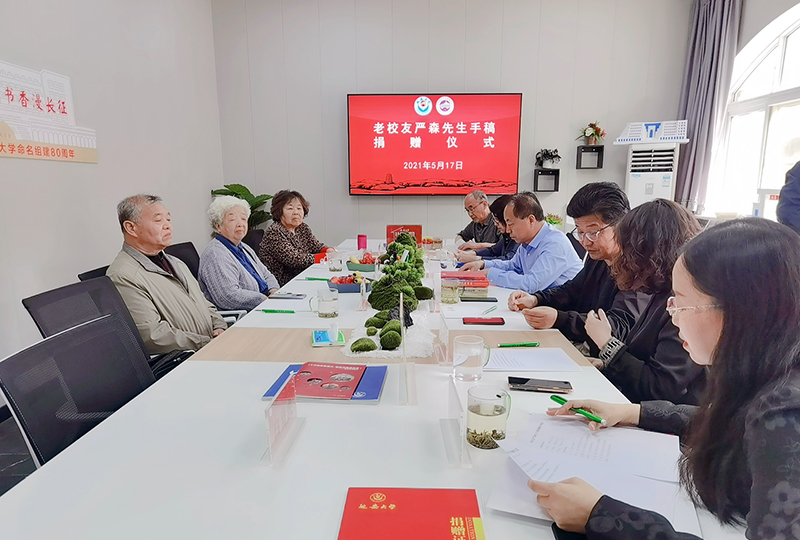 本网讯 5月17日下午,已故校友严森子女严苏华、严苏建、严苏会在杨家岭校区“校友之家”向学校捐赠了其父手稿等物品。米兰副校长付峰,党政办、发展规划处、对外交流与合作处等部门相关负责同志参加了捐赠仪式。
