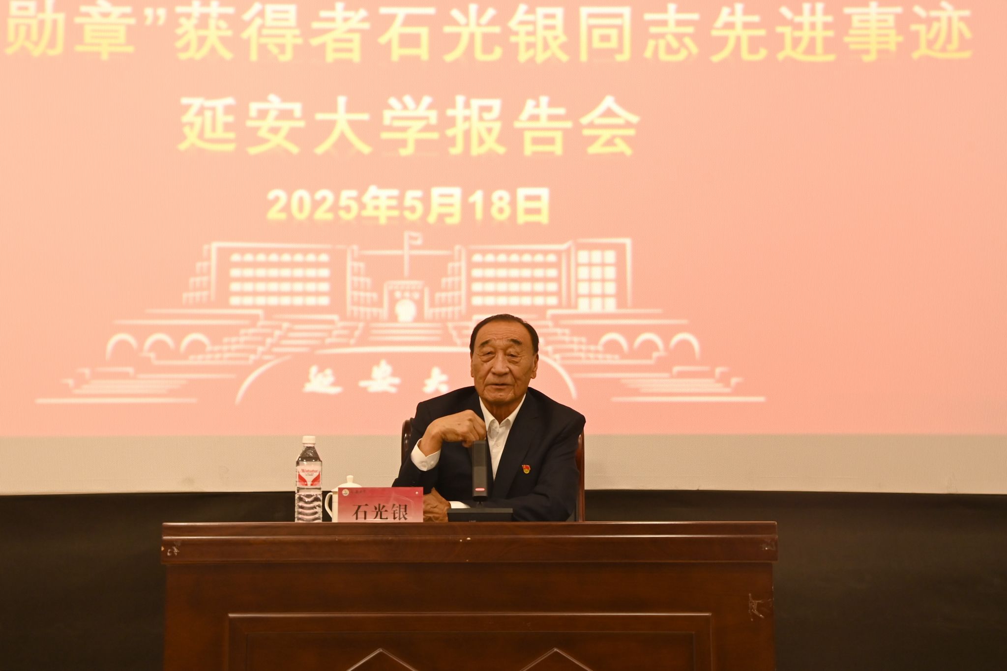 本网讯 5月18日上午,学校在新城校区大学生活动中心红色影院举办“七一勋章”获得者石光银同志先进事迹报告会。此次报告会旨在引领青年学子深入学习英雄事迹,大力弘扬劳模精神。现场400余名师生齐聚一堂,共同聆听石光银的故事,从中汲取源源不断的奋斗力量。报告会由党委副书记吕达主持。