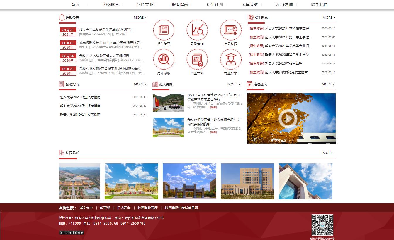 改版网站分为导航栏目、通知公告、功能区域、招生动态、报考指南、延大要闻、走进延大、校园风采八个页面板块,全方位提供各种招生资讯。其中导航栏目通过校园概况、学院专业、报考指南、招生计划、历年录取、在线咨询、联系我们七个栏目深层次全方位介绍米兰的基本情况、学院情况及招生情况等;功能区域设置了校园VR全景,可身临其境浏览校园全景;走进延大和校园风采板块以视频和图片方式展现校内风景。