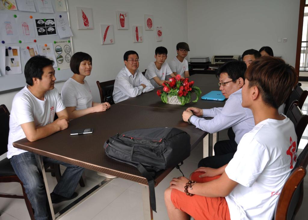 本网讯 6月6日上午,党委副书记田伏虎在党办副主任解文元的陪同下,到鲁艺学院红色文化艺术设计工作室调研。田伏虎副书记肯定了工作室的办公环境和前期的工作,并与指导老师及设计工作室成员进行了亲切交谈。