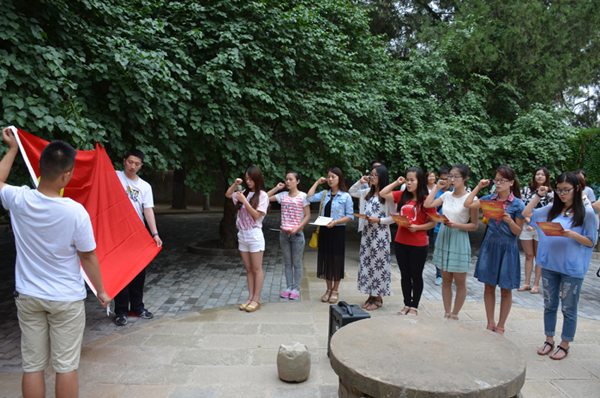 本网讯 为了深入学习习近平总书记“三严三实”讲话精神,积极推进党员教育工作,丰富党员培养模式,切实加强新形势下党建工作,6月27日上午,外语学院组织全院教职工党员和学生党员,在杨家岭革命旧址中共大礼堂前组织开展了现场教学和纳新党员入党宣誓活动。学院党委书记董振文、院长吴卫东等领导及全院教工、学生党员共计80余人参加了本次活动。活动由学院党委副书记王随卷主持。