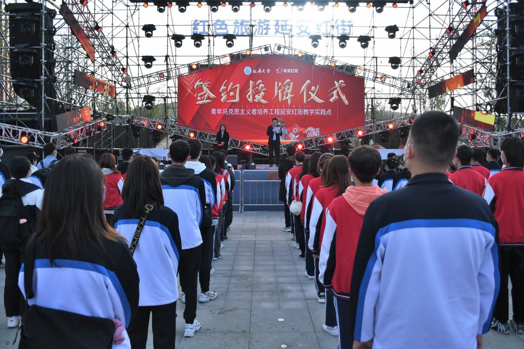 本网讯 10月10日下午,校团委在延安红街开展2021年青年马克思主义者培养工程延安红街教学实践点签约授牌仪式。参加本次活动的有校团委副书记杨醒思,延安红街总经理薛亚茹,校团委社团部部长赵世翔以及校院学生骨干100人。