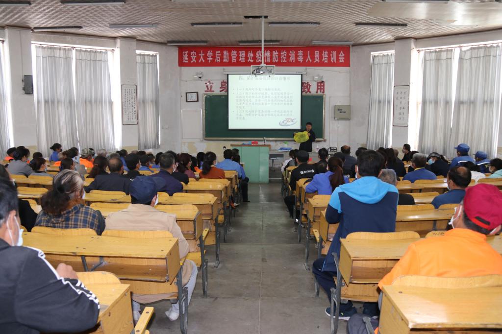 本网讯 4月26日上午,后勤集团绿化环卫中心在校本部第三阶梯教室组织关于疫情防控消洒药物配制技能及人员防护知识培训会。学校后勤集团副总经理张志宇、校医院院长梁丽,延安市疾控中心卫生监测科科长杨景浩、疾控中心工会副主席孙小勇,以及米兰后勤各部门的相关消洒人员及物业公司负责人等90余人参加了培训会。