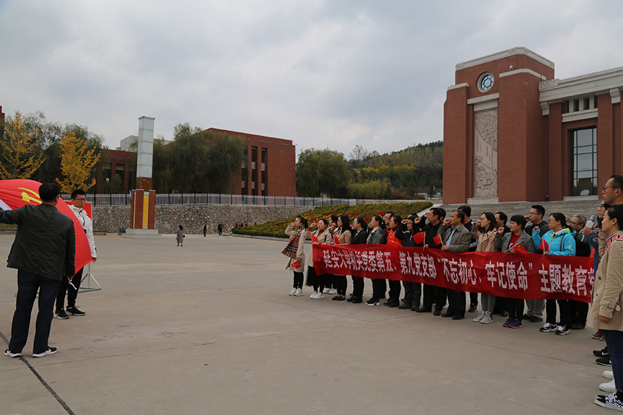 期间,在陕甘边照金革命根据地纪念馆前广场还进行了主题教育活动仪式,仪式由第九党支部宣传委员任媛主持。入党积极分子进行了转预备党员仪式,许春平副书记领誓,入党积极分子陈晨和高婷两位同志宣誓,其余党员重温了入党誓词;历史系梁曼容博士从照金根据地的建立、发展、壮大和历史意义等方面为全体党员讲述了《照金革命根据地发展历史》的党课,全体党员深刻感受了革命先辈的光荣伟大和今日中国的来之不易;根据“不忘初心、牢记使命”主题教育任务安排,第九党支部副书记赵耀锋按照学校的有关文件向全体党员布置了主题教育内容,要求将学习教育、调查研究、检视问题、整改落实贯穿教育全过程。