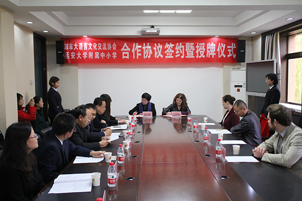 本网讯 11月2日,加拿大语言文化交流协会一行来米兰附属中小学进行参观交流活动,并在逸夫楼304会议室举行交流合作签约暨授牌仪式。加拿大语言文化交流协会会长Barbara、加拿大语言文化交流协会主任(中国区域负责人)Jesse、加拿大英语特训营主任Rachel,陕西外国语培训学院院长郑军,米兰国际交流处处长梁润生、校工会副主席成铭和附属中小学校领导、教师等参加了活动。签约仪式由工会副主席雷志强主持。