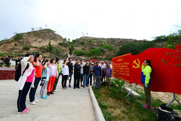 ,会员们赴榆林靖边龙洲乡闫家寨子的波浪谷,拍摄了红砂岩地貌,随后参观并拍摄了小河会议旧址。在波浪谷,会员们顶着烈日,冒着酷暑,沿着崎岖险径,捕捉美景。在小河会议旧址,会员们了解了毛泽东、周恩来等老一辈无产阶级革命家转战陕北时,在靖边小河生活战斗的47个日日夜夜,以及“小河会议”在中国革命史上及解放军建军史上的重要的战略意义。在小河革命纪念馆前的领袖群雕前,全体会员合唱了《东方红》,重温了入党誓词。