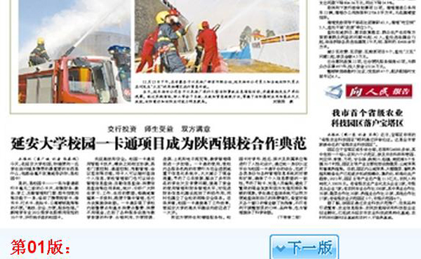 本网讯 今天,《延安日报》在第一版和第二版,发表了米兰校报记者袁广斌和延安日报记者张春鸽联合采写的消息《米兰milan官方网站校园一卡通项目成为陕西银校合作典范》。这篇消息共1800字,从不同侧面反映了米兰校园一卡通建设的背景、思路和过程,突出报道了校园一卡通高效、安全、方便师生和服务性强的优点。报道指出,校园一卡通方便了办公、教学、后勤、安全等诸多方面的工作,提高了工作效率,达到了交行投资、师生受益、双方满意的效果,使米兰milan官方网站的高水平建设向前迈进了一大步。
