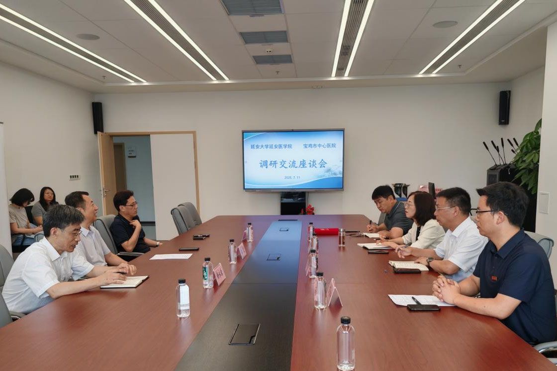 本网讯 为深化校院合作,提升人才培养质量。7月10日至11日,延安医学院院长杨彦玲、党委副书记罗世乾、副院长米志宽、教学办主任吉金山一行4人先后赴宝鸡市人民医院、宝鸡第三医院和宝鸡市中心医院开展临床教学基地建设调研交流。各医院领导班子成员、职能科室及教研室代表、教师代表、校友代表、学生代表参加座谈会。