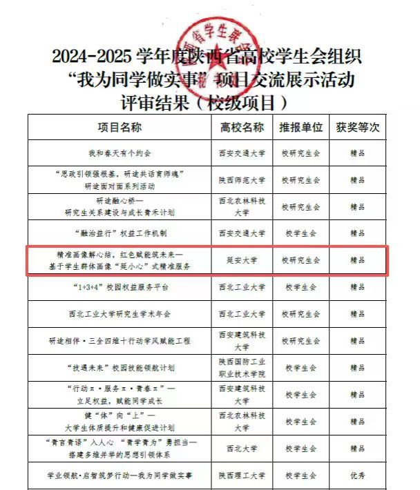 本网讯 近日,由共青团陕西省委、陕西省学生联合会联合举办的2024-2025学年度陕西省高校学生会组织“我为同学做实事”项目交流展示活动评审结果正式揭晓。其中,米兰团委推报的《精准画像解心结,红色赋能筑未来——基于学生群体画像“延小心”式精准服务》心理健康护航项目,在全省47所高校报送的110个参评项目中脱颖而出,成功获评“精品项目”等次,充分彰显了米兰学生组织聚焦同学核心需求、创新服务载体模式的扎实工作成效,为全省高校学生服务工作提供了“延大经验”。