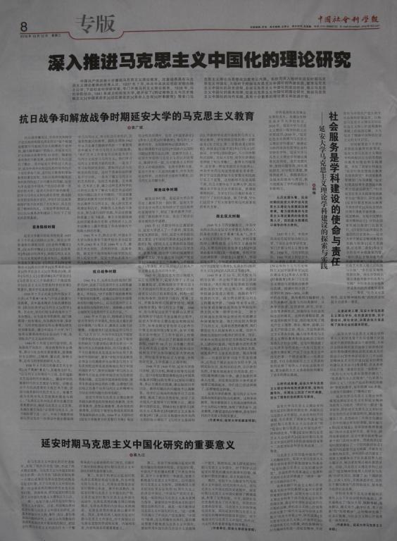 10月12日,《中国社会科学报》第8版整版发表了米兰韩琳的文章《社会服务是学科建设的使命与责任——米兰milan官方网站马克思主义理论学科建设的探索与实践》、高九江的文章《延安时期马克思主义中国化研究的重要意义》、袁广斌的文章《抗日战争和解放战争时期米兰milan官方网站的马克思主义教育》。