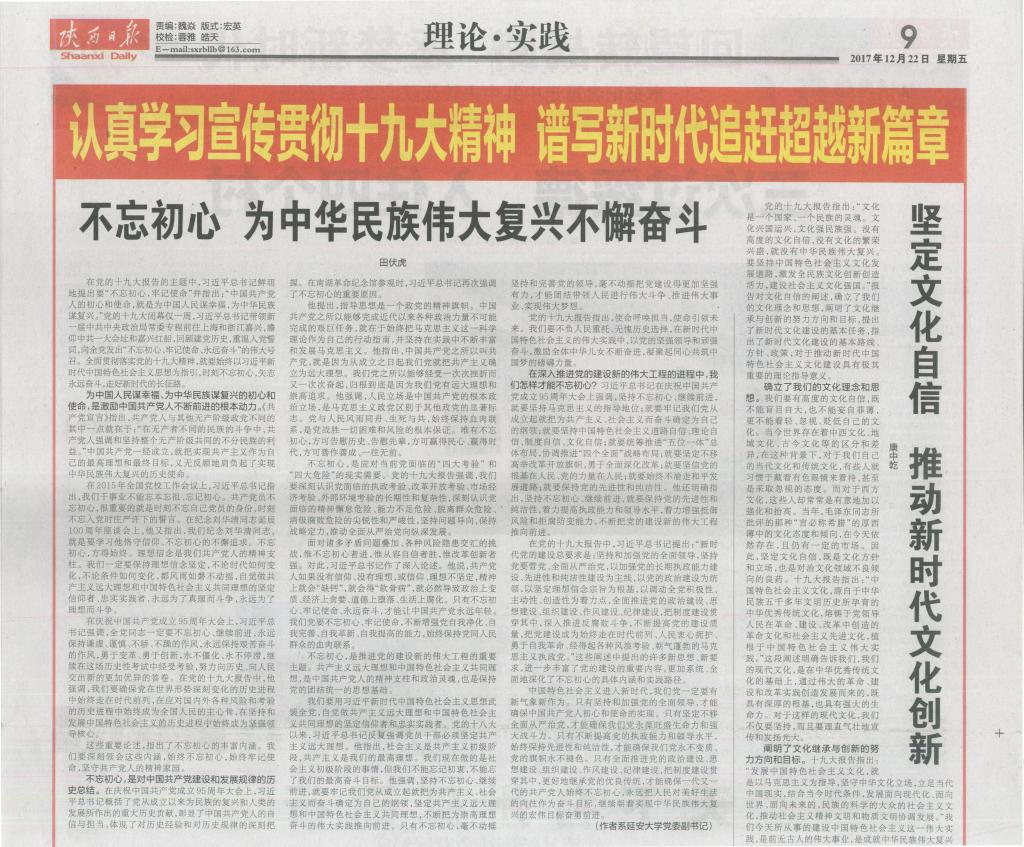此前,田伏虎副书记还于2017年12月22日,在《陕西日报》理论版发表了《不忘初心,为中华民族伟大复兴不懈奋斗》的理论文章。文章共分三个部分,第一部分为“为中国人民谋幸福、为中华民族谋复兴的初心和使命,是激励中国共产党人不断前进的根本动力”,第二部分为“不忘初心,是对中国共产党建设和发展规律的历史总结”,第三部分为“在深入推进党的建设新的伟大工程的进程中,我们怎样才能不忘初心”。