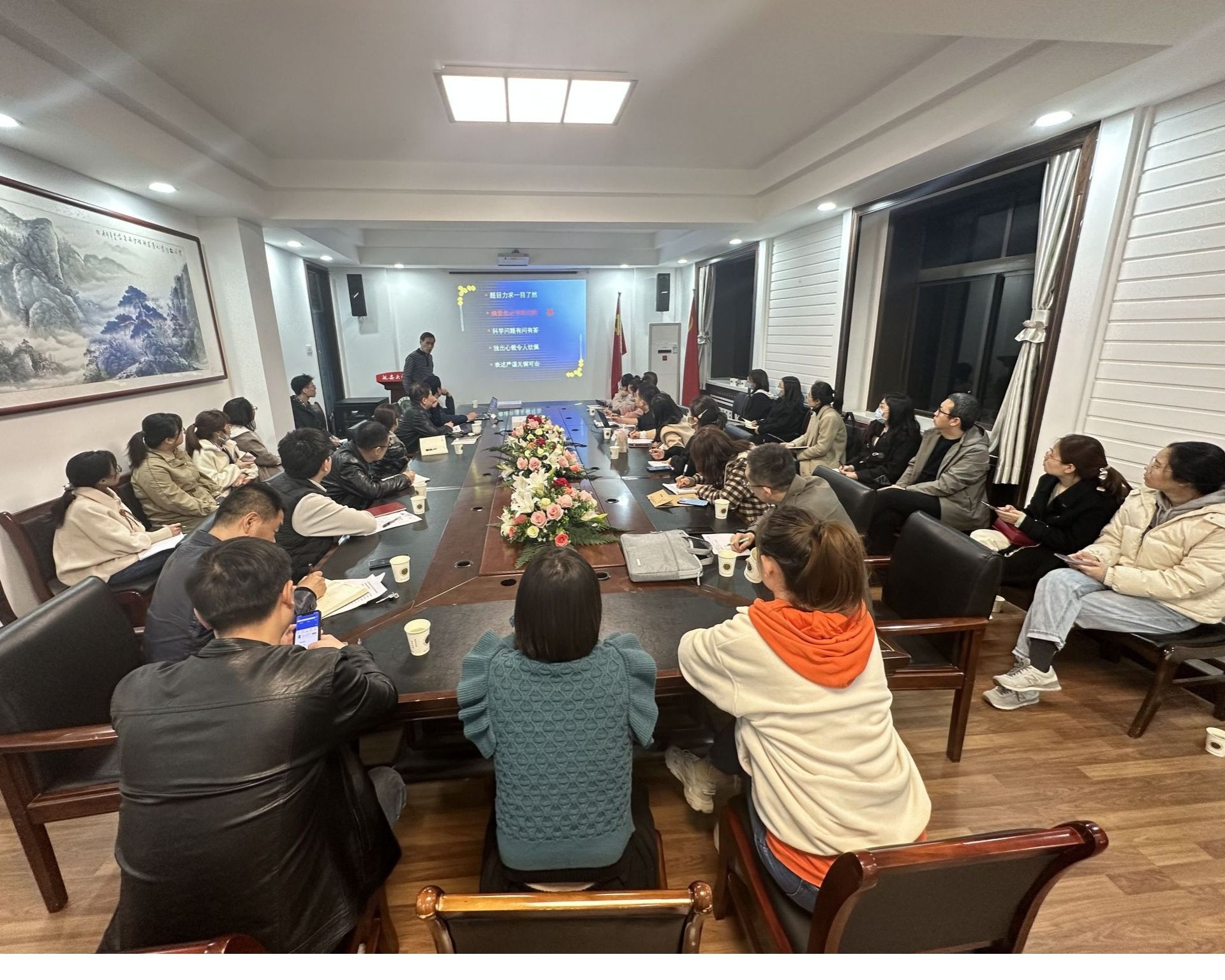 会上,欧周罗教授就NSFC申请书撰写的要点与修改润色展开讲解。从选题、摘要、研究进展、研究内容及目标、科学问题、研究方案及技术路线、创新点、预期成果等方面进行了详细的阐述。尤其强调题目力求一目了然,细节方面严谨细致,科学问题有问有答,摘要字斟句酌。