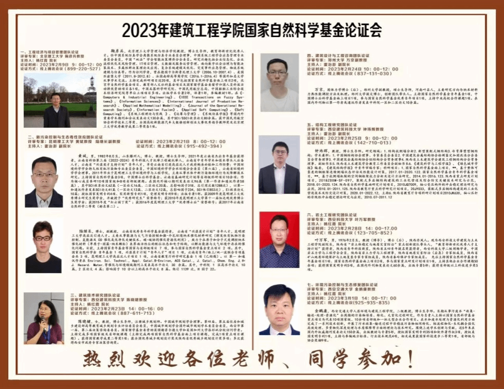 2023年2月9日至2023年3月1日,我院建筑技术研究团队、岩土工程研究团队、建筑设计与工程咨询研究团队、结构设计研究团队、工程经济与项目管理团队、环境污染控制与生态修复团队、新污染物控制与生态毒性效应团队7个团队分别邀请西安建筑科技大学陈晓键教授、西安科技大学叶万军教授、郑州大学万京副教授、西安建筑科技大学钟炜辉教授、北京理工大学鞠彦兵教授、西安交通大学金鹏康教授、昆明理工大学黄斌教授、陆继长副教授8位专家教授,以线上线下相结合的方式,分组开展了我院国家自然科学基金项目申报论证会。申报论证会由院长杨红霞、副院长霍治澎主持。