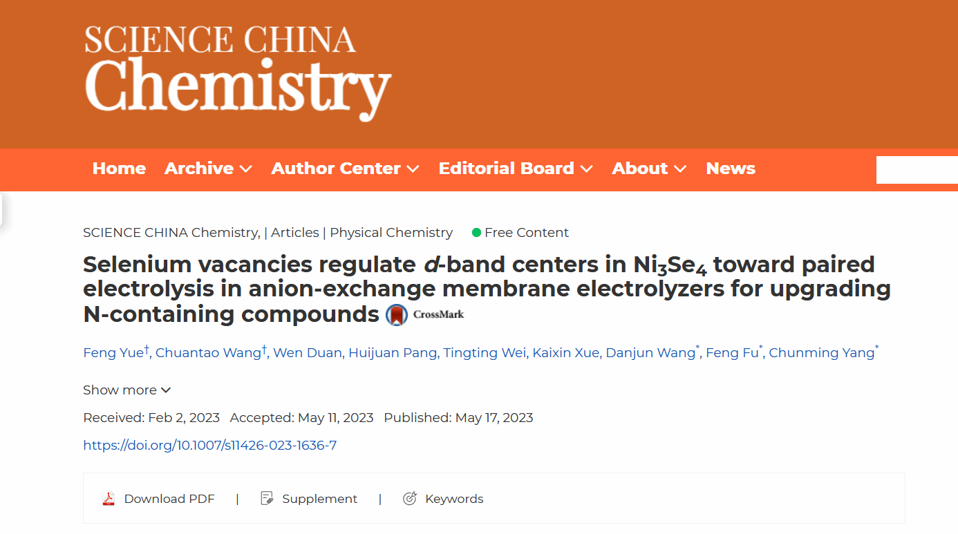 近日,米兰延能-延大综合能源产业技术研究院和陕北多能融合现代能源体系未来产业创新研究院在国际顶级期刊Science China Chemistry(中科院一区TOP,IF 10.138)上发表了题为“Selenium vacancies regulate d-band centers in Ni3Se4 toward paired electrolysis in anion-exchange membrane electrolyzers for upgrading N-containing compounds”的学术论文。Science China Chemistry由中国科学院和国家自然科学基金共同主办,《中国科学》杂志社出版,并与Springer出版集团合作面向海外发行。期刊主要报道化学科学及其交叉领域的基础和应用研究方面的创新性成果。