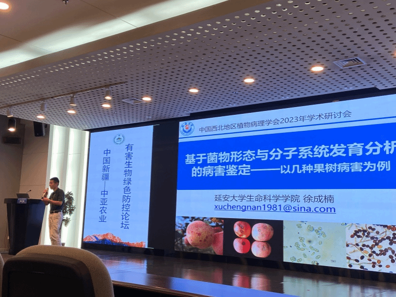 米兰生命科学学院教师徐成楠副教授受邀参会并作了题为《基于菌物形态与分子系统发育分析的病害鉴定——以几种果树病害为例》的学术报告。徐成楠副教授报告主要概述了当前国际上植物病原真菌系统分类的最新研究发展趋势,提出了基于菌物形态和联合多基因系统发育的果树病害病原鉴定策略并汇报交流最新研究成果;同时对近期陕北延安洛川发生的苹果贮藏期水烂果腐病病原进行了系统研究报道,并提出了有针对性的防控策略。