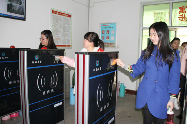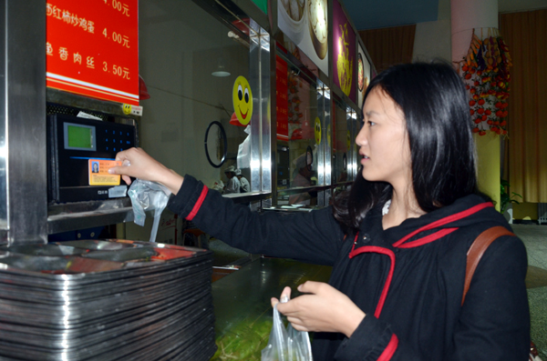 是的,是校园卡——一张与普通银行卡毫无二致的小卡片,却集财务、教务、学工、后勤管理和门禁、图书馆使用等功能于一身,省却了携带购饭卡、借书卡、打水卡、洗浴卡、公寓楼钥匙等等的不便。“高效、安全、方便,服务性强。”新闻学专业2012级学生殷柳用简短的10个字,评价她手里的校园卡。