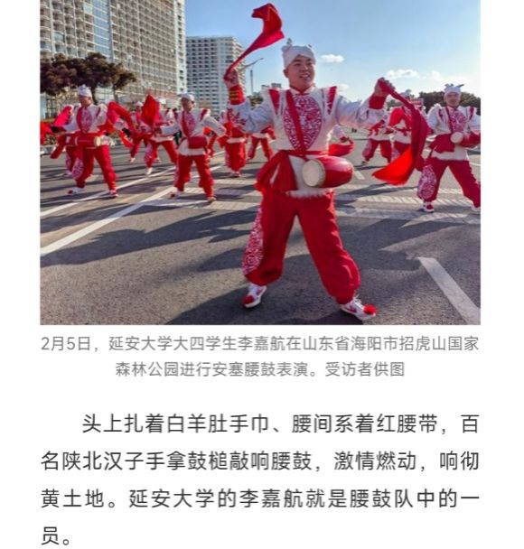 春节期间,学院21级李嘉航、24级张文伯等同学积极参与“非遗”春节活动,成为村里腰鼓队的一员。其中,李嘉航同学跟随村里腰鼓队登上了2024年中国网络社会组织联合会年会、平凉市2025年春节联欢晚会的舞台,受到了《中国青年报》的关注和报道。作为历史专业的李嘉航,深知安塞腰鼓的历史文化与传承,他希望安塞腰鼓走出陕北、走向世界,让更多的年轻人喜爱“非遗文化”,以自己的青春风采展示和宣传中国的优秀传统文化。