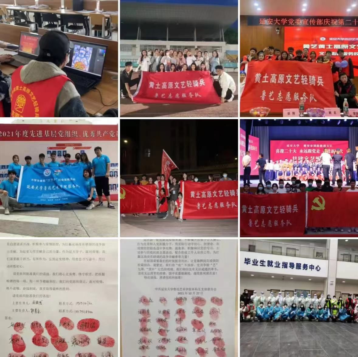 在鲁艺,每一位同学都是“黄土高原文艺轻骑兵”的一员。学院在夯实学生专业水平的基础上,面向学校、面向陕北地区开展具有延安鲁艺红色文艺底蕴的文艺服务和保障,音乐、舞蹈、美术、设计专业发挥专业特长,以得天独厚的天然使命和天然优势为出发点,以全面提升艺术专业学生专业素养为前提,深刻传承老鲁艺人优秀特质为使命诠释志愿服务的意义。
