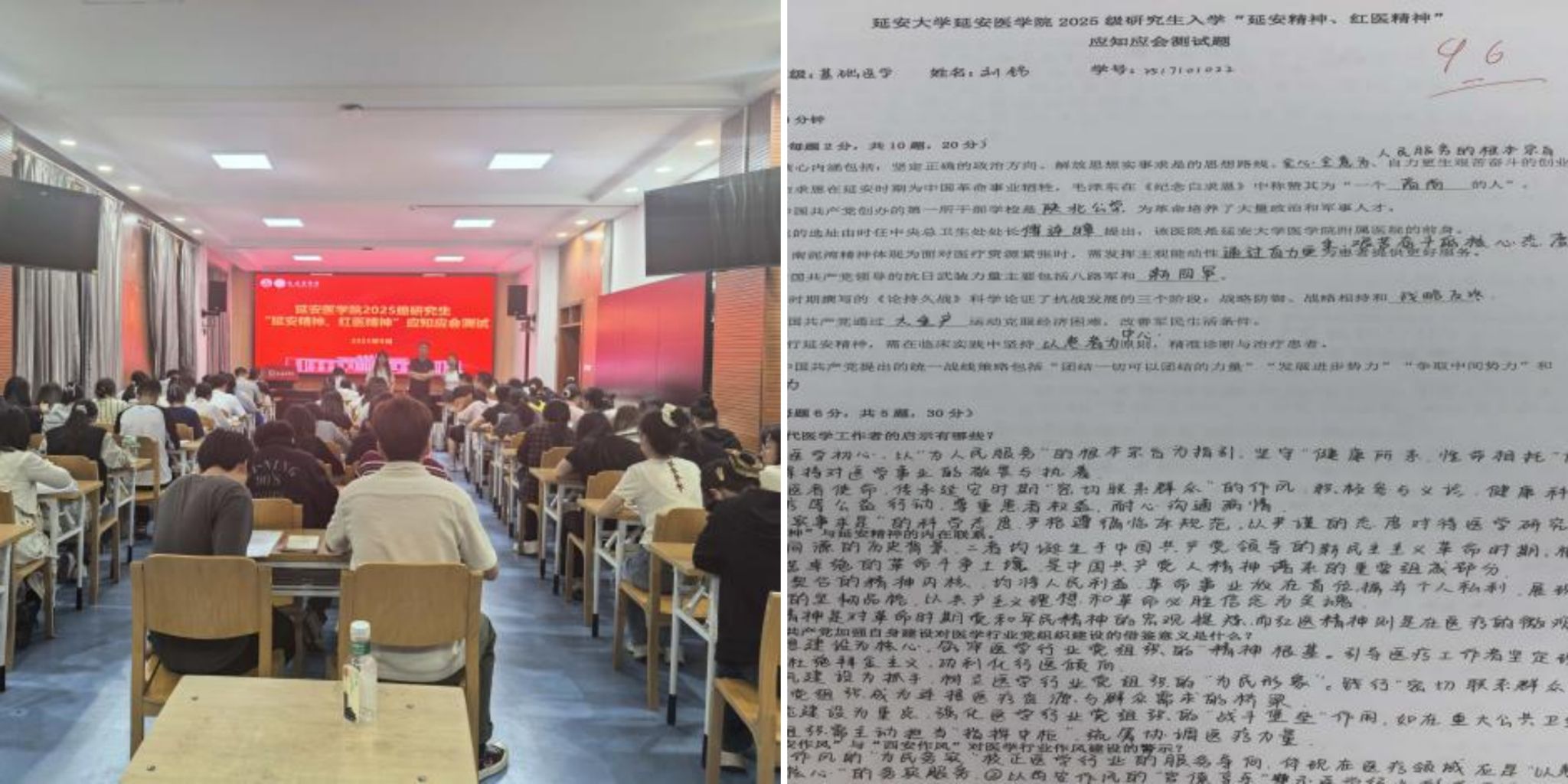 9月8日晚,星海楼105楼灯火通明,2025级研究生迎来特殊考试——“延安精神·红医精神”应知应会测试。试卷薄薄两页,却分量千钧:“延安精神的灵魂是什么?”“白求恩‘五种人’标准指哪五种?”“‘窑洞对’对当代医学生廉洁行医的启示?”没有选择题,只有简答与论述;允许翻笔记,却不许抄套话。90分钟里,笔尖与纸张摩擦出沙沙声,像一场无声的延河夜谈。阅卷结果显示,平均分93分,但老师们更在意的是卷尾那句自由作答——“如果延安精神有颜色,那一定是病人的血色与生命的绿色”。