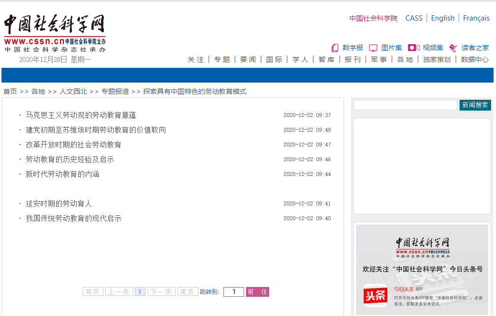 本网讯 3月20日中共中央、国务院发布《关于全面加强新时代大中小学劳动教育的意见》,要求充分认识新时代培养社会主义建设者和接班人对加强劳动教育的新要求,全面构建体现时代特征的劳动教育体系。马克思主义学院在认真学习、研究习近平总书记关于劳动教育的系列重要论述、中国共产党劳动教育思想与实践后编写了教材《中国共产党劳动教育概论》。以此为基础,参编者先后撰写了《我国传统劳动教育的现代启示》《马克思主义劳动观的劳动教育意蕴》《建党初期至苏维埃时期劳动教育的价值取向》《延安时期的劳动育人》《改革开放时期的社会劳动教育》《新时代劳动教育的内涵》《劳动教育的历史经验及启示》等7篇文章,并于2020年12月22日在《中国社会科学报》第六版通版刊发。随后,这7篇文章在中国社会科学网上刊发,引起广泛影响。