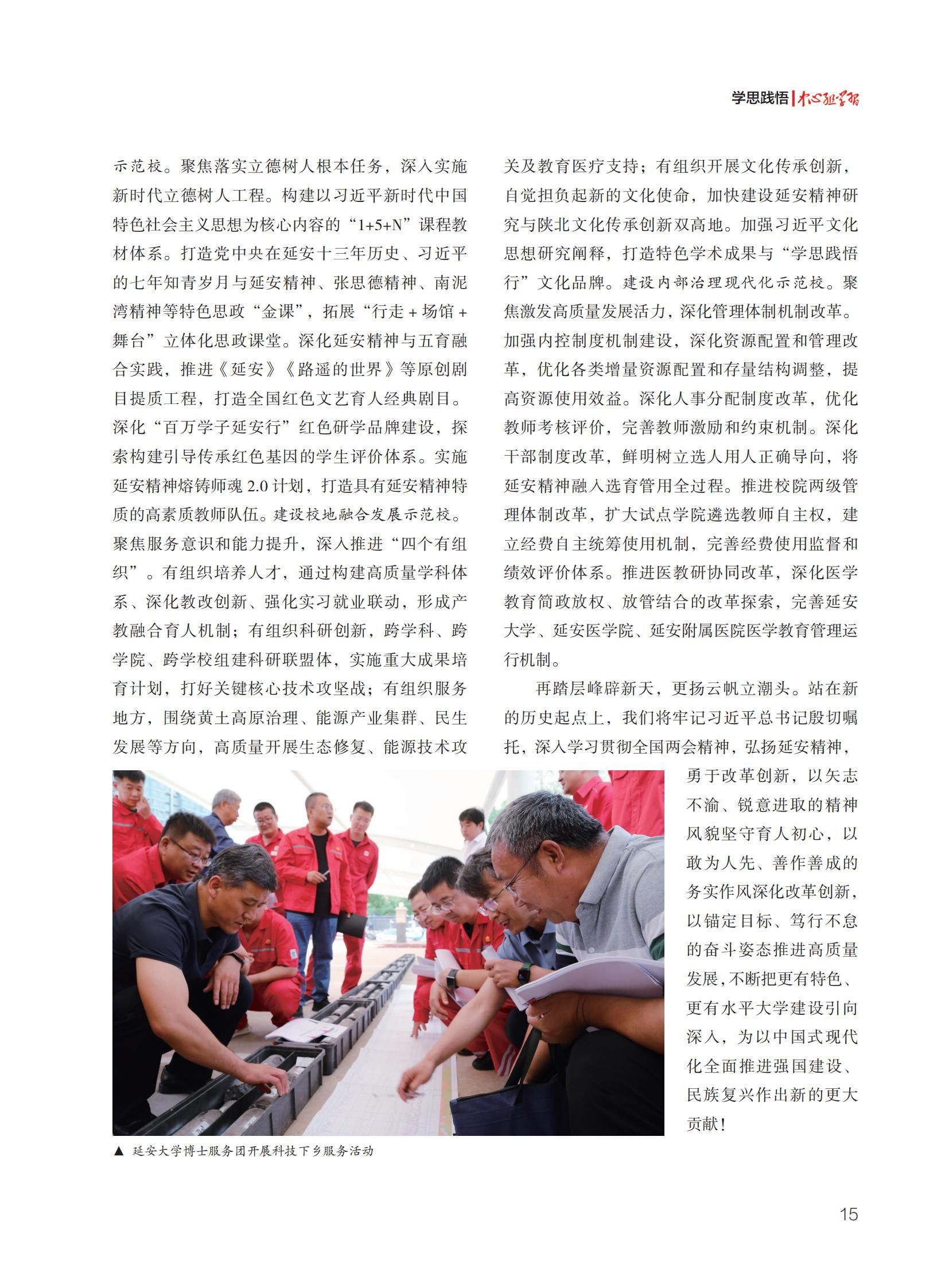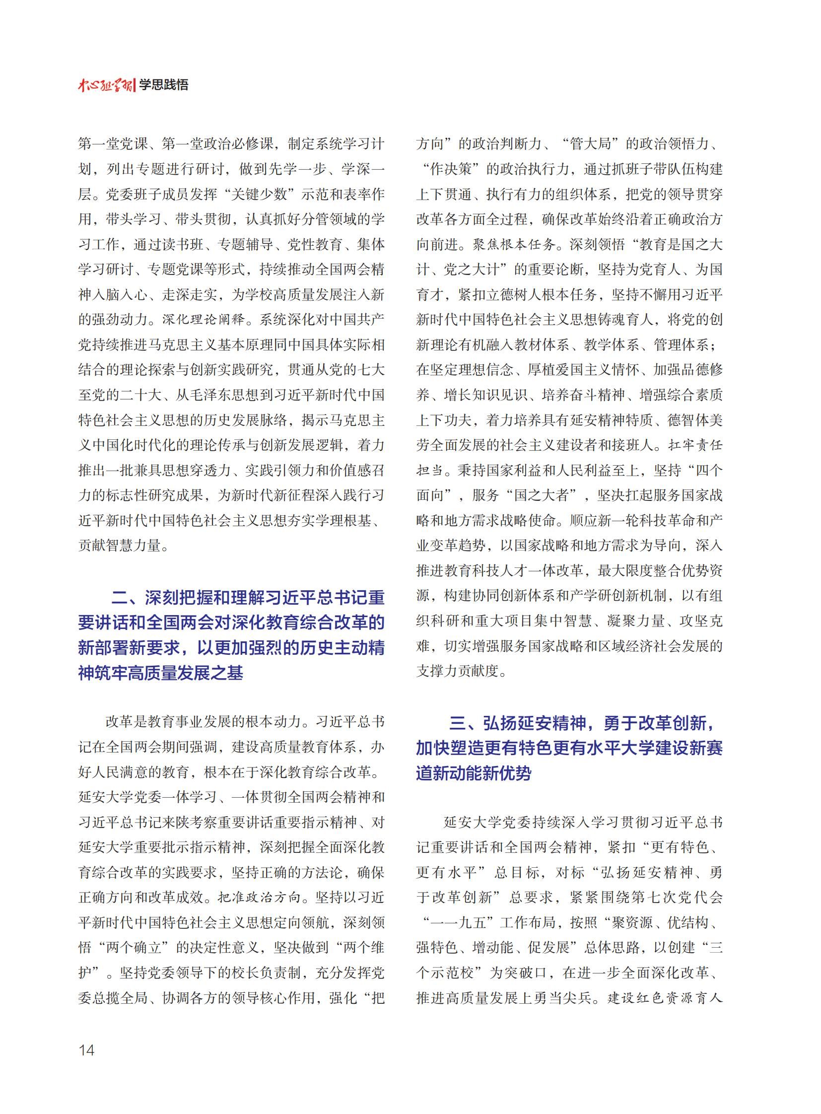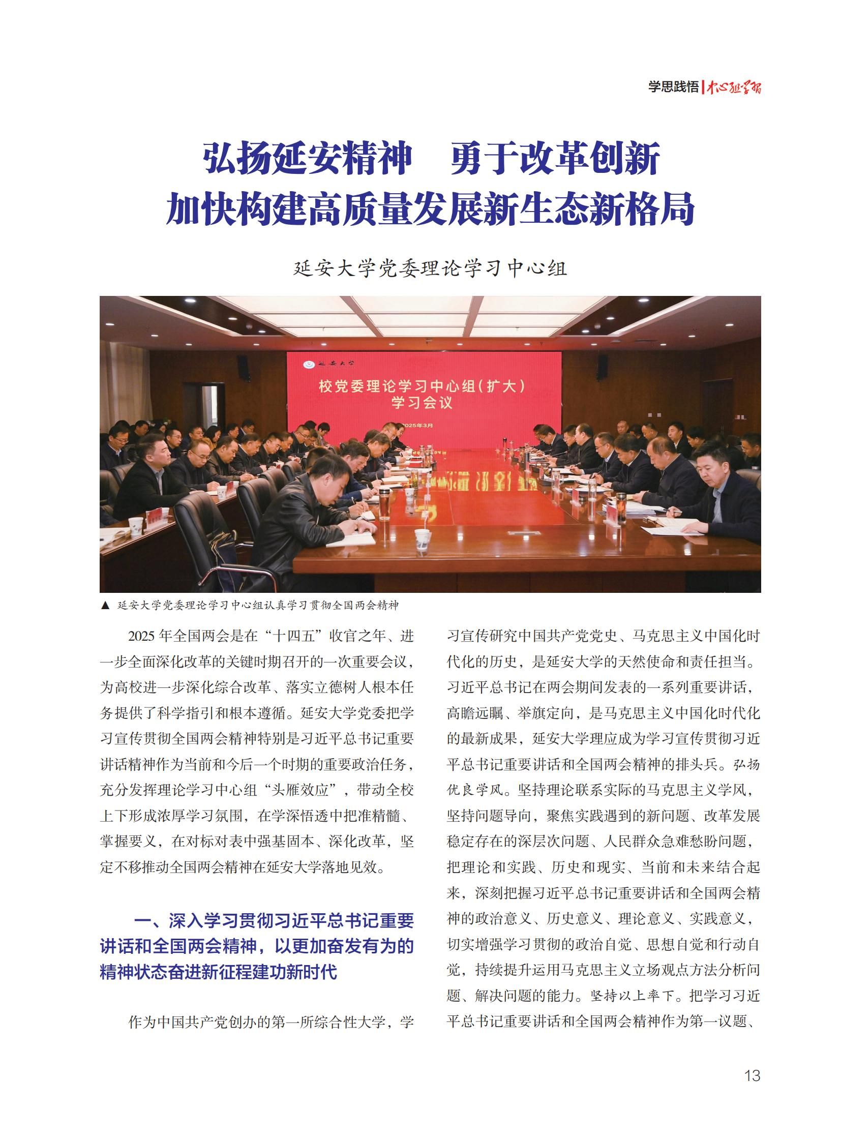 文章从“深入学习贯彻习近平总书记重要讲话和全国两会精神,以更加奋发有为的精神状态奋进新征程建功新时代”“深刻把握和理解习近平总书记重要讲话和全国两会对深化教育综合改革的新部署新要求,以更加强烈的历史主动精神筑牢高质量发展之基”“弘扬延安精神,勇于改革创新,加快塑造更有特色更有水平大学建设新赛道新动能新优势”三个方面,阐述了米兰贯彻落实习近平总书记重要讲话和全国两会精神的理论思考、实践探索与创新成果。