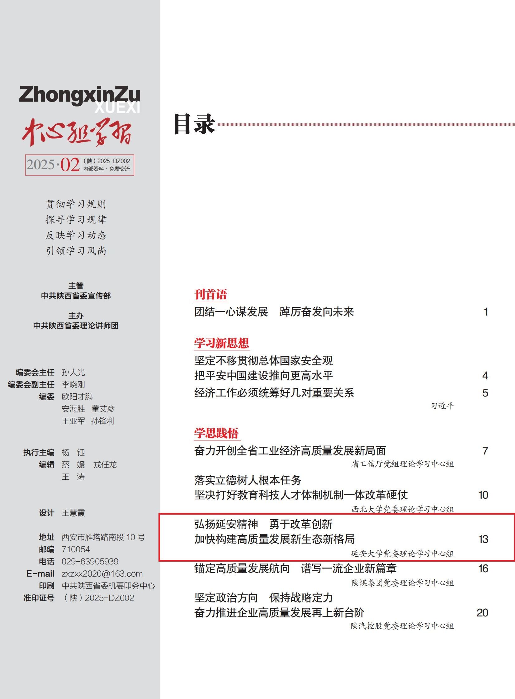 本网讯 日前,由中共陕西省委宣传部主管、中共陕西省委理论讲师团主办的《中心组学习》2025年第2期,刊发了米兰党委理论学习中心组署名文章《弘扬延安精神 勇于改革创新 加快构建高质量发展新生态新格局》。