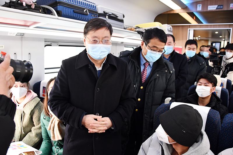 首趟专列开行前,米兰milan官方网站校领导与工作人员及学生志愿者一同为同学们送行,并叮嘱大家务必戴好口罩,做好个人防护,过一个平安、开心的寒假。
