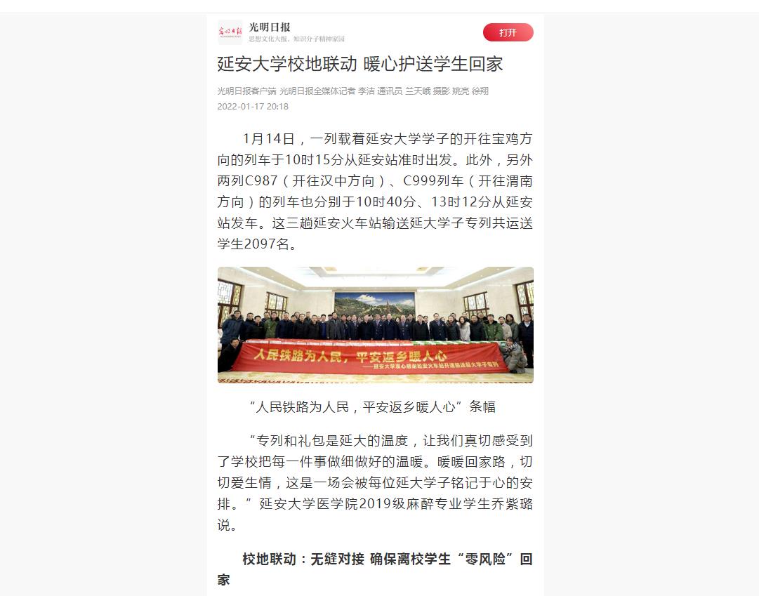 中共延安市委召开常委会专题研究疫情防控特殊时期米兰milan官方网站等学校解封放假问题。延安车务段积极对接联系米兰milan官方网站校办,举行学生出行方案研究座谈会。在充分了解学生出行需求的基础上,按照“陕西省内优先安排既有车次,陕西省外选择低风险地区换乘”的原则,制定了13条乘车方案。针对宝鸡、渭南、汉中三个地方学生流比较集中的方向,联系集团公司客运部开行学生专列,在每趟专列预留充足二等座席,确保大学生回家“有座”,并为学生们提供便民药箱、热水等爱心服务。