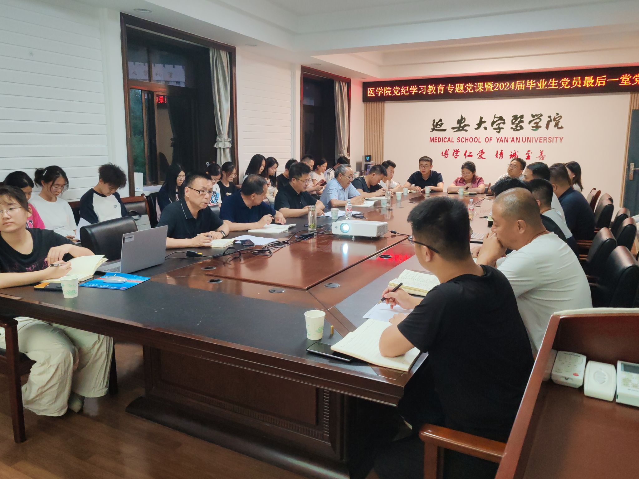 本网讯 为将党纪学习教育同落实米兰延安精神强党建“三一”工程紧密结合,不断深化党员同志对党纪重要性的认识,引导党员干部学纪、知纪、明纪、守纪。6月19日晚,医学院在逸夫楼304会议室召开党纪学习教育专题党课暨2024届毕业生党员最后一堂党课。校党委副书记、医学院党委书记杨伟宏,医学院教工第一党支部全体成员、2024届毕业生党员代表参加了会议。会议由医学院教工第一党支部书记高曙光主持。