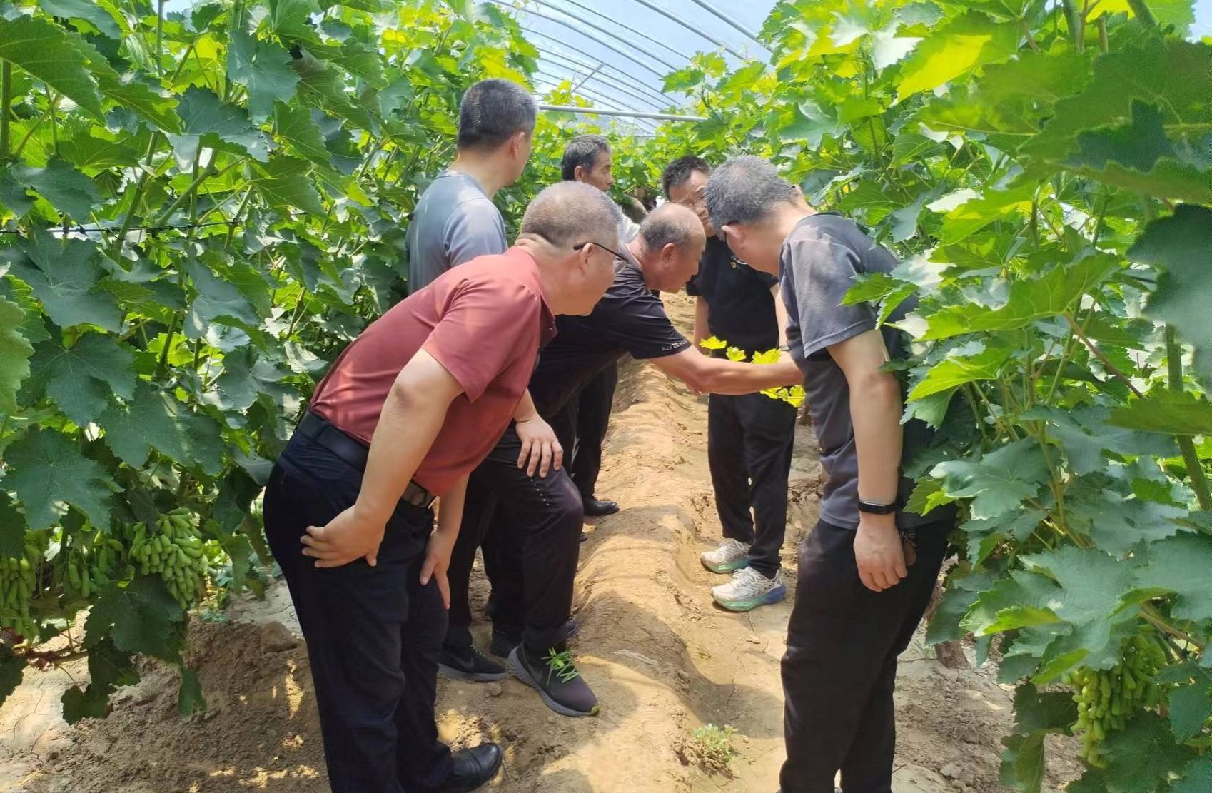 随后,白亚军一行走进葡萄大棚实地查看葡萄长势,结合葡萄田间管理、病虫害防治、品种多样化种植、土肥管理等方面对果农进行了现场培训指导。