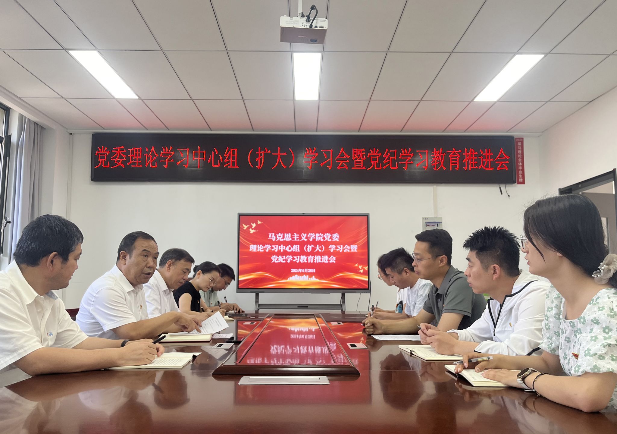 本网讯 为深入学习领会习近平总书记关于全面加强党的纪律建设的重要论述,切实增强党员严守党纪的政治自觉、思想自觉、行动自觉。6月28日上午,马克思主义学院党委召开理论学习中心组(扩大)会暨党纪学习教育推进会。学院全体领导班子成员、各支部书记及全体行政人员参加了会议。会议由学院党委常务副书记张彬主持。