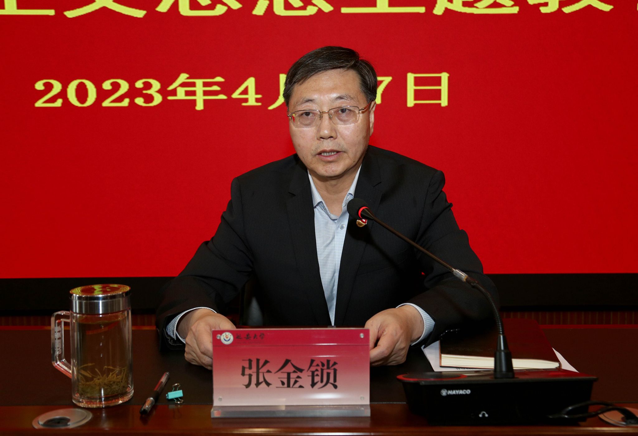 就扎实开展好学校主题教育,张金锁提出三点要求:一是深刻认识主题教育的重大意义,切实增强开展主题教育的政治自觉、思想自觉、行动自觉。要从深刻认识这次主题教育是锤炼党性、铸牢忠诚的政治教育,是武装头脑、凝心铸魂的思想教育,是破解难题、推动发展的实践教育,是自我革命、纯洁队伍的作风教育等四个方面来把握好这次主题教育。二是准确把握主题教育目标要求,高质量完成主题教育各项工作任务。要牢牢把握“学思想、强党性、重实践、建新功”的总要求,坚持学思用贯通、知信行统一,把习近平新时代中国特色社会主义思想转化为坚定信念、锤炼党性和指导实践、推动工作的强大力量,使全党始终保持统一的思想、坚定的意志、协调的行动、强大的战斗力,努力实现凝心铸魂筑牢根本、锤炼品格强化忠诚、实干担当促进发展、践行宗旨为民造福、廉洁奉公树立新风的目标。要着力在理论学习上务求“深”、调查研究上务求“真”、检视整改上务求“严”、推动更有特色更有水平大学建设上务求“实”、为师生办实事上务求“快”、在作风能力建设上务求“转”等六个方面狠抓落实,抓出成效,推动主题教育走深走实走心。三是加强组织领导,确保主题教育取得实实在在的成效。要坚持以上率下、创新方式方法、注重统筹兼顾、加强宣传引导,营造浓厚氛围。