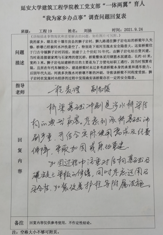 开展“我为家乡办点事”活动。由学生在每年寒暑假期间,调研家乡与所学专业相关的难题,思考并梳理出需要解决的问题,返校后和指导教师联合进行研究,形成可行性意见或建议,提供给相关部门或个人参考使用。